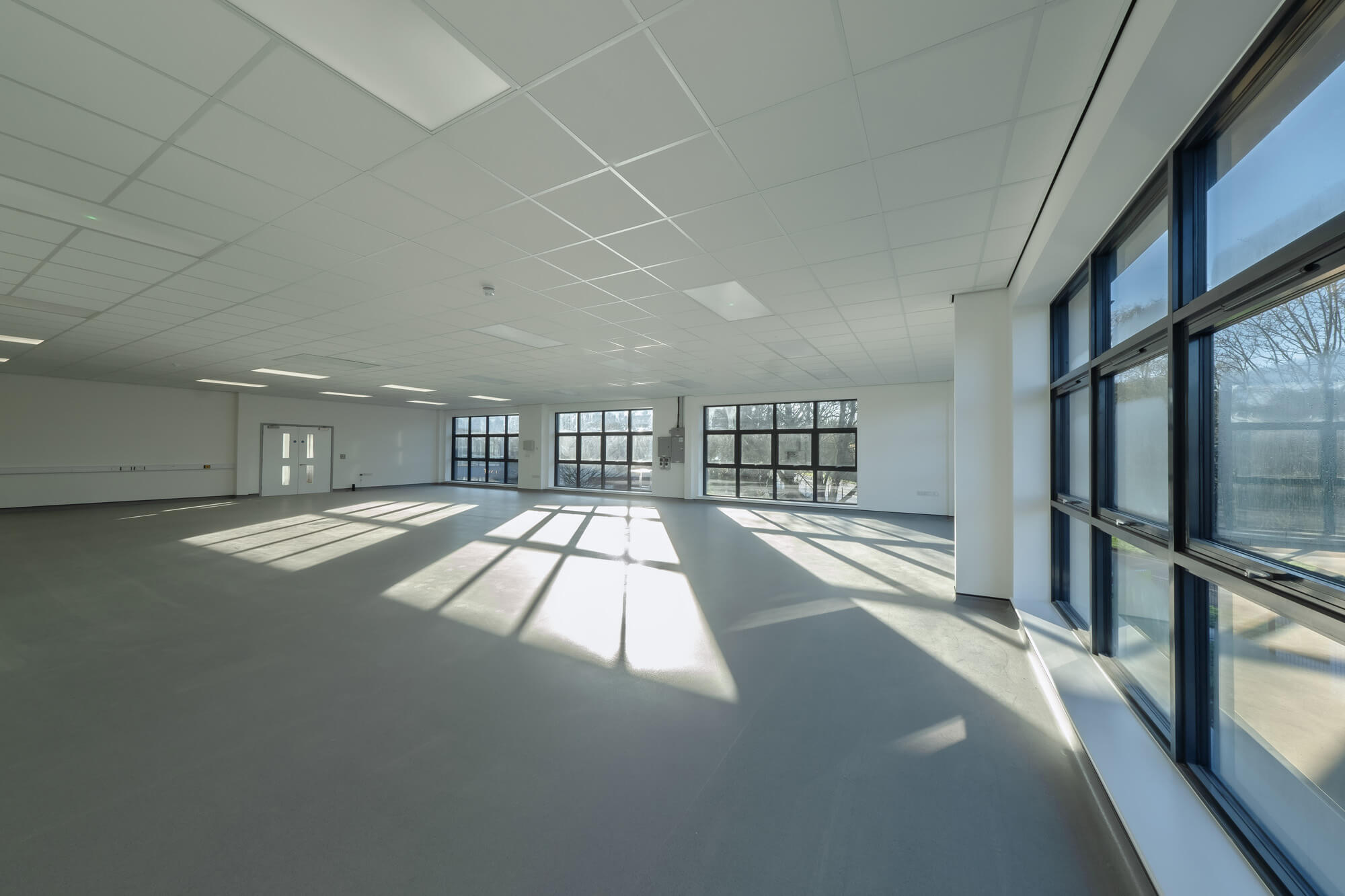 The Green Skills Academy development is located on a vacant plot of land to the west of the main campus. The concept for the Green Skills Academy building provides new teaching workshops and studios to support developing skills required for green industries and technologies as net zero moves forward. The facility contains 3 teaching workshops, material storage bays and ancillary areas on the ground floor and a multi-use teaching studio, office and further ancillary areas on the first floor.