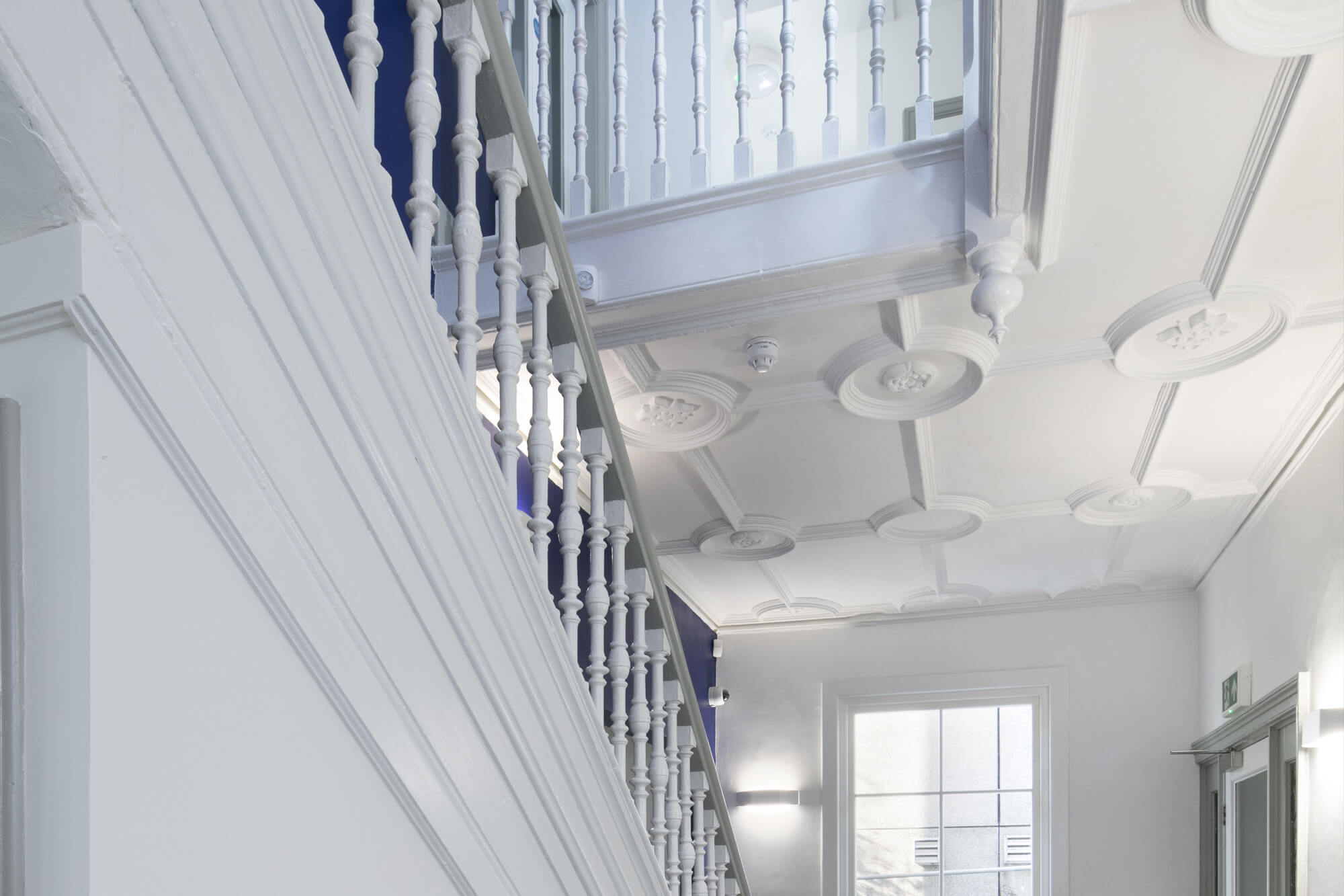 Internally, the layout was reconfigured to create modern, flexible workspace while retaining as much of the original building fabric as possible. The main feature staircase was restored and repaired, and later partitions were removed to reveal the building’s original proportions. Historic timber doors were retained, repaired and redecorated, while modern doors were replaced with new timber doors designed to reflect the character of the originals.