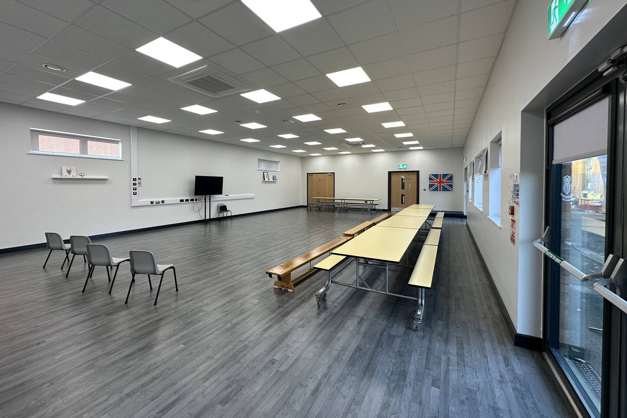 Building on the success of this scheme, we were later appointed to manage the demolition of an ageing modular building and design and deliver a new purpose-built school hall. The new facility includes a kitchen, storage areas, toilets, and a flexible hall space for assemblies, performances, and community use.
